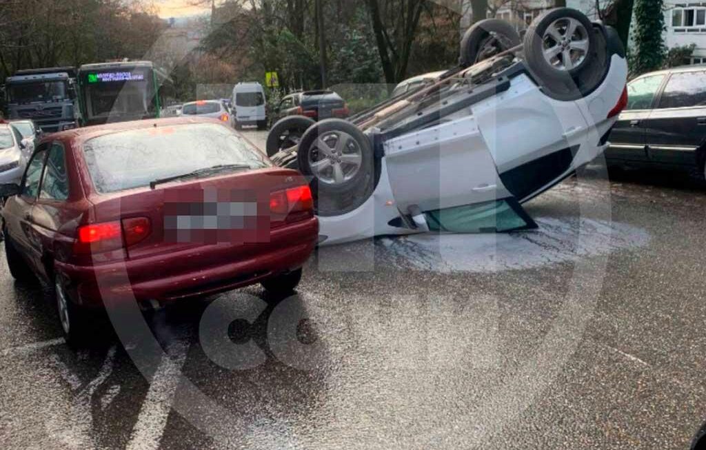 Автомобиль перекрыл проезжую часть в узком месте между припаркованными у обочины машинами. Как водителю удалось перевернуть машину, не уточняется. Пока нет информации о пострадавших.